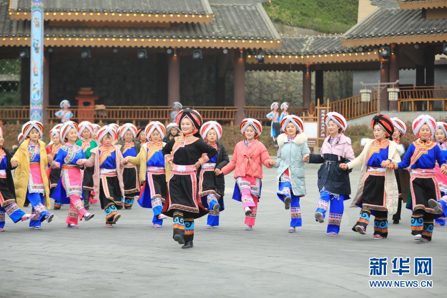 贵州省黔西南布依族苗族自治州晴隆县三宝彝族乡易地搬迁群众穿上盛装,围着篝火跳起阿妹戚托舞,迎接新年的到来(2020年12月31日摄)。