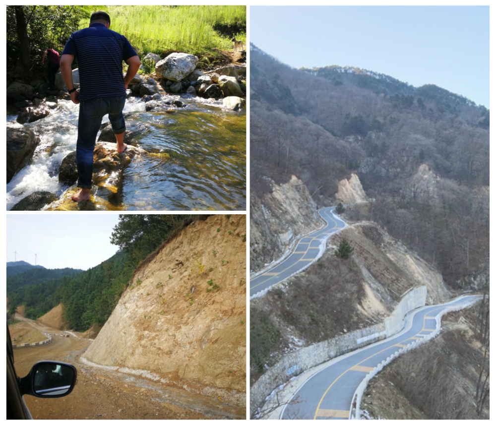 拼版照片:左上图为2017年8月23日,记者蹚水去农户家采访。左下图为2017年7月27日,记者乘车行驶在大湾村沙土路面上。右图为2020年12月20日记者拍摄的大湾村山上的盘山道(新华社记者陈诺 摄)