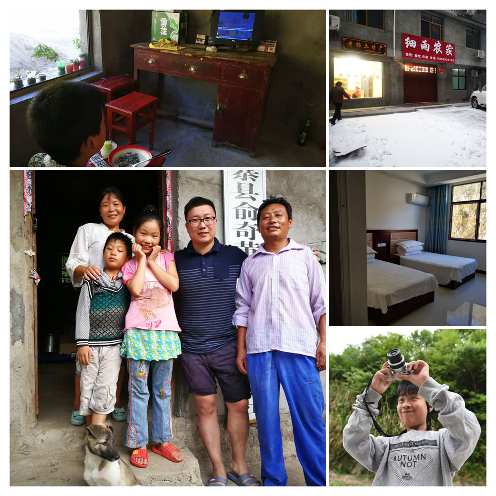 拼版照片:左上图为2017年8月23日,杨俊杰在自家的毛坯房间里吃早饭,看电视。左下图为记者与杨俊杰一家合影。右上图为杨俊杰家新开的农家乐和土特产店。右中图为农家乐住宿房间内景。(新华社记者陈诺 摄)右下图为杨俊杰用相机拍照。(新华社记者周牧 摄)