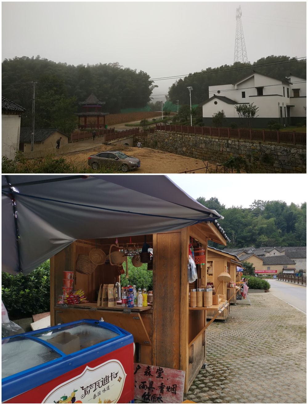 拼版照片:上图为2017年10月10日,记者拍摄的大湾村村景。下图为2020年8月18日,大湾村的路边售卖特产的小木屋。(新华社记者陈诺 摄)