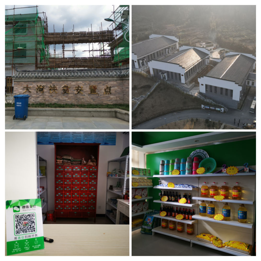 拼版照片:左上图为2019年建设中的扶贫安置点之一。左下图为大湾村卫生院内景。右上图为大湾村茶厂航拍画面。右下图为大湾村振风超市货架。(新华社记者陈诺 摄)