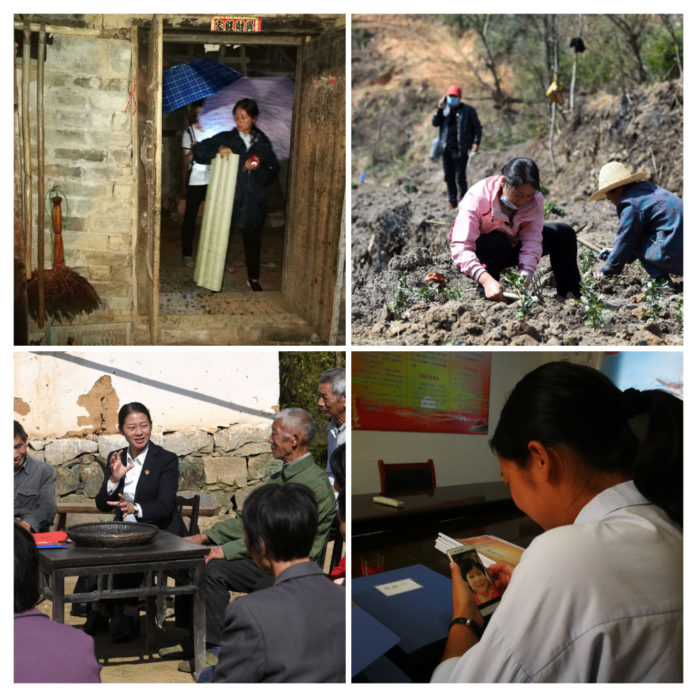 拼版照片:左上图为2017年7月31日,余静在转移危房群众现场。(新华社记者陈诺 摄)左下图为2017年10月27日,余静(中)作为十九大代表回到大湾村与村民交流。(新华社记者刘军喜 摄)右上图为2020年3月20日,余静(中)在指导村民种植茶树。(新华社记者周牧 摄)右下图为2017年8月2日,余静在与女儿视频通话。(新华社记者陈诺 摄)