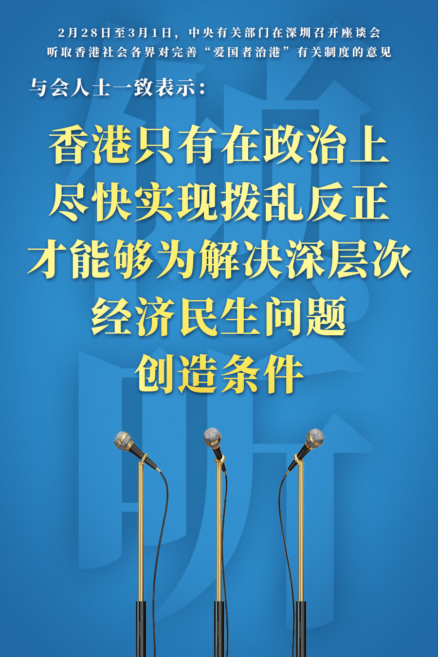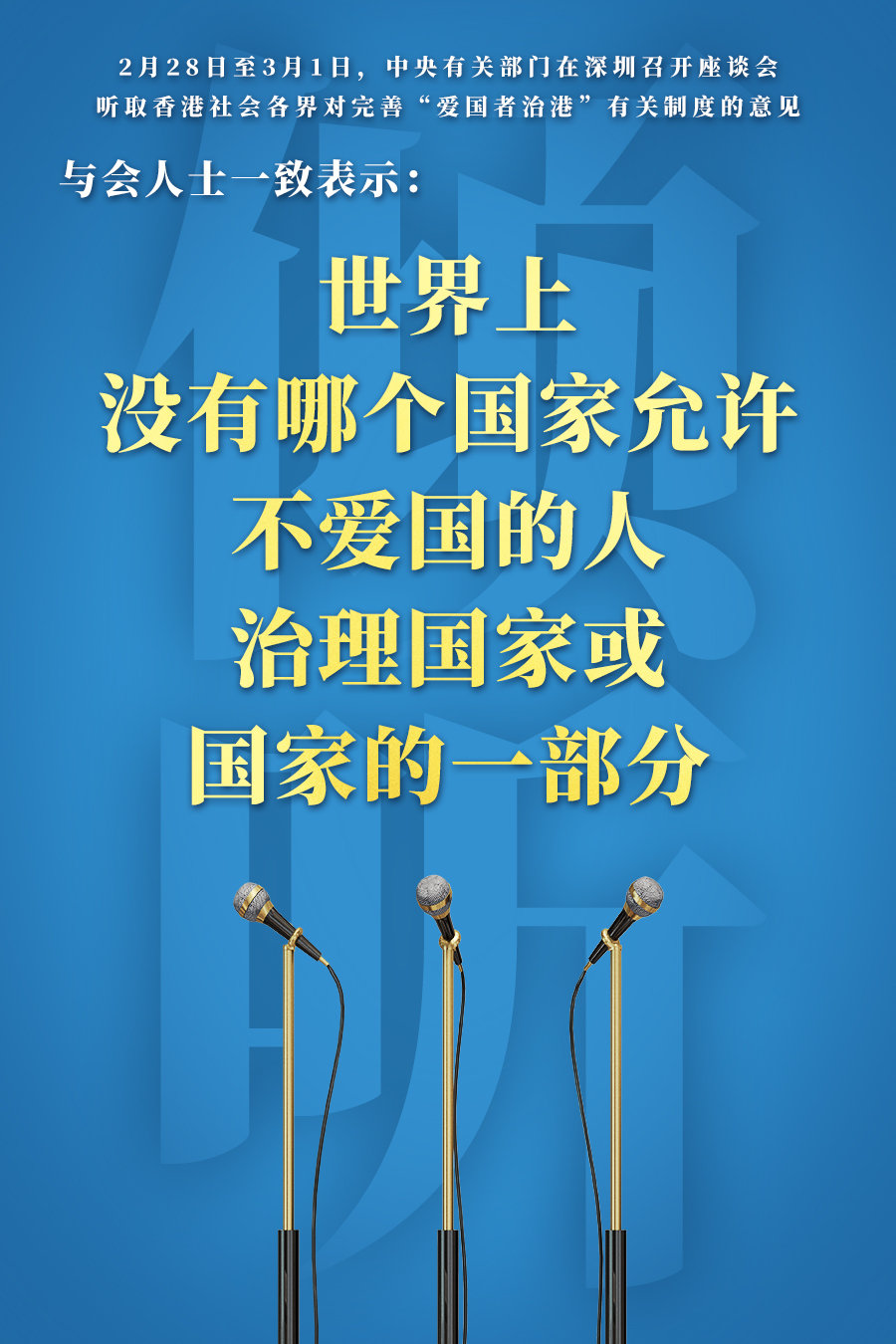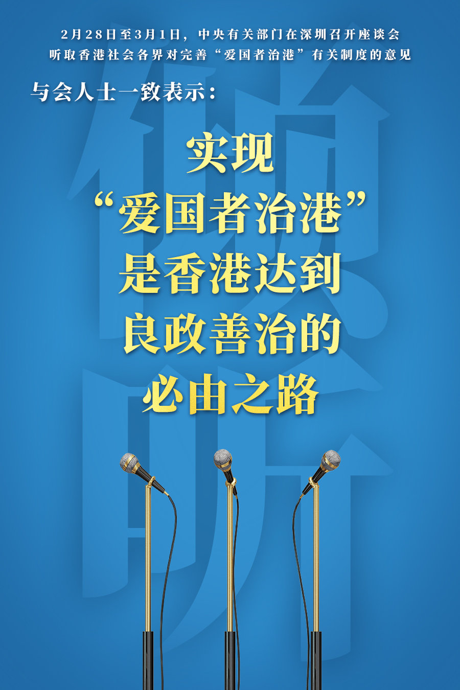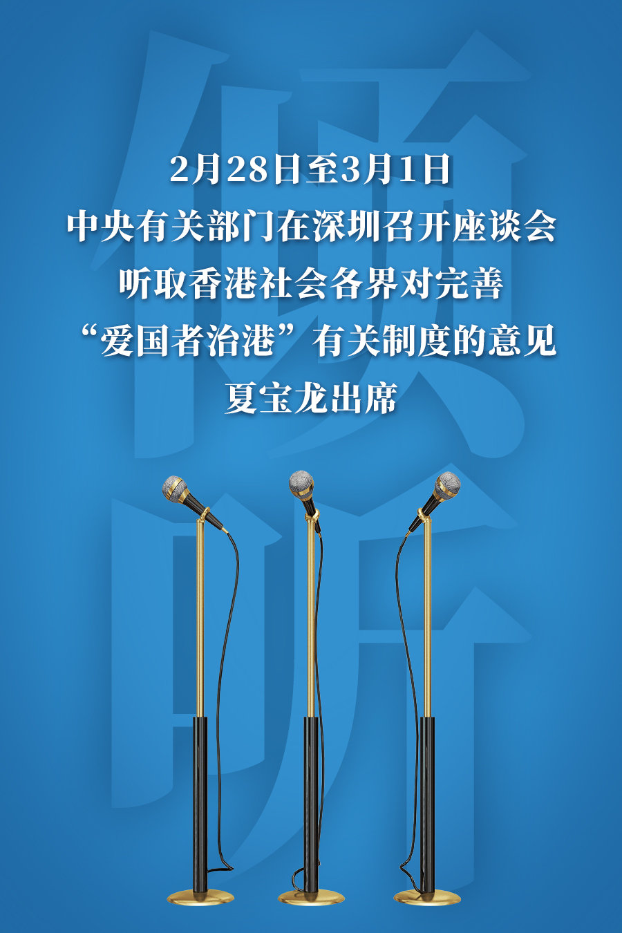 新华社深圳3月1日电 中央有关部门2月28日至3月1日在深圳召开座谈会,广泛听取香港社会各界代表人士对完善“爱国者治港”有关制度的意见。全国政协副主席、国务院港澳事务办公室主任夏宝龙与中央有关部门负责同志出席了座谈会。