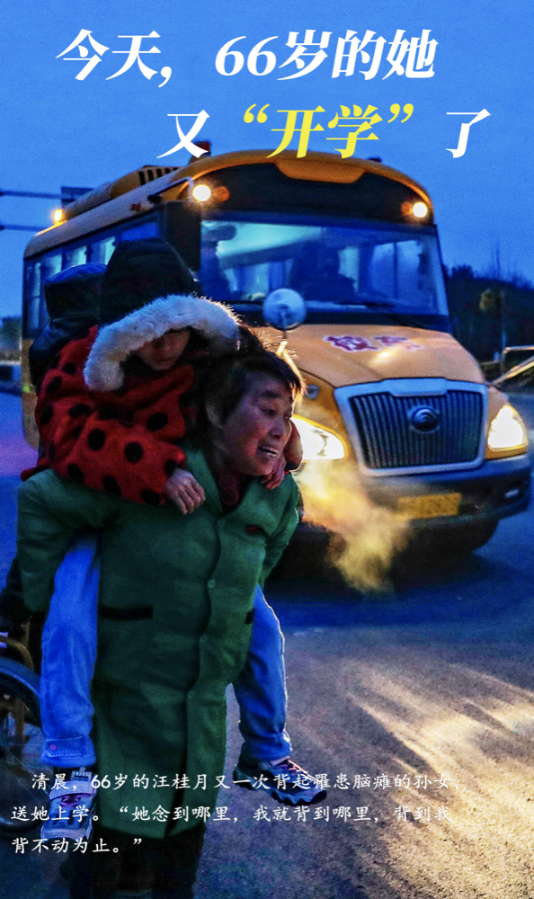 当校车渐近,车灯投来橘黄色的光束,汪桂月又要咬紧牙关,奋力将60多斤重的孙女从轮椅里抱上肩头,再一鼓作气地将她背上校车。