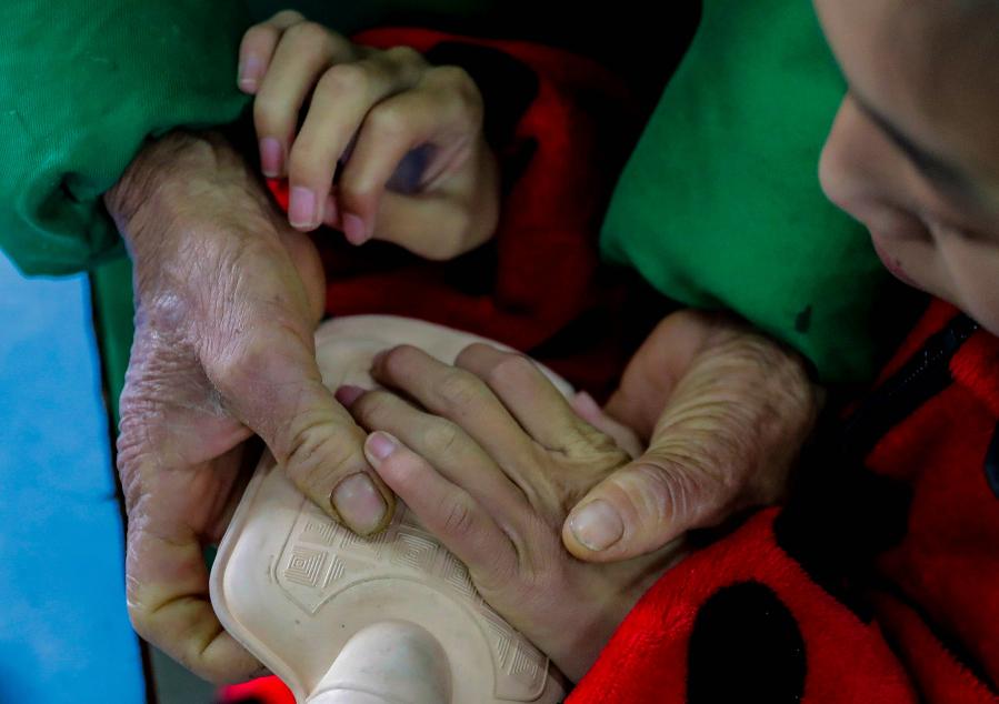 汪桂月用热水袋给婷婷暖手。周峰摄(新华社发)