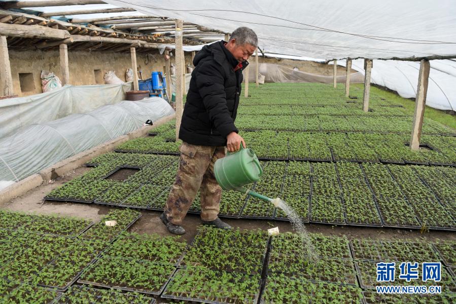 在新疆生产建设兵团第六师五家渠市一〇二团梧桐镇4连,职工宋文保在温室大棚内给培育的菜苗浇水(2月27日摄)。新华社记者 丁磊 摄