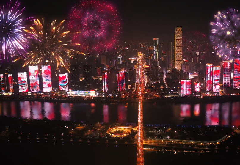 2021年春节长沙湘江两岸“送你一朵云烟花”灯光秀(湖南卫视供图)