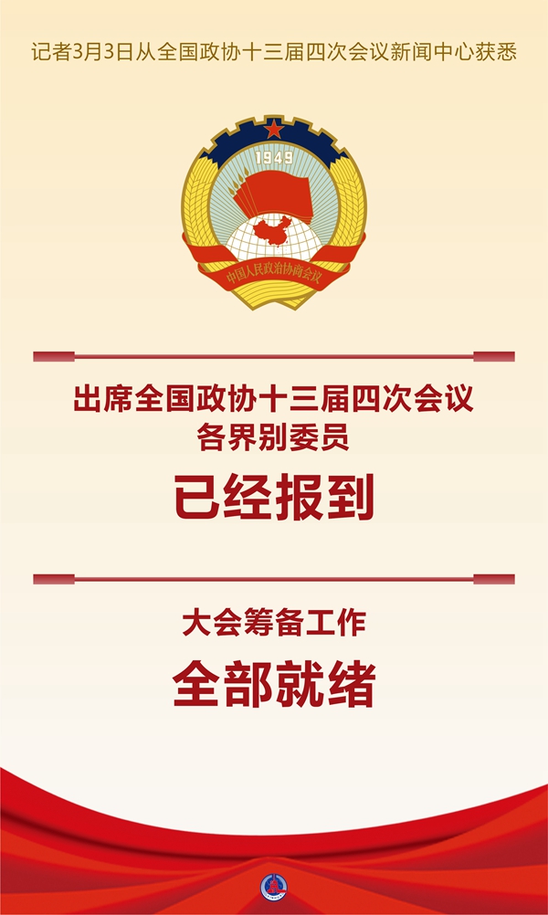 新华社北京3月3日电 记者3日从全国政协十三届四次会议新闻中心获悉,出席此次会议的各界别委员已经报到,大会筹备工作已全部就绪。