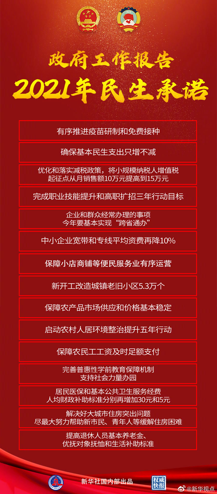 5日提请十三届全国人大四次会议审议的政府工作报告提出,今年要切实增进民生福祉,注重解民忧、纾民困,及时回应群众关切,持续改善人民生活。有序推进疫苗研制和免费接种,新开工改造城镇老旧小区5.3万个,保障农民工工资及时足额支付……这些民生承诺直抵民心。(海报设计:朱舜)