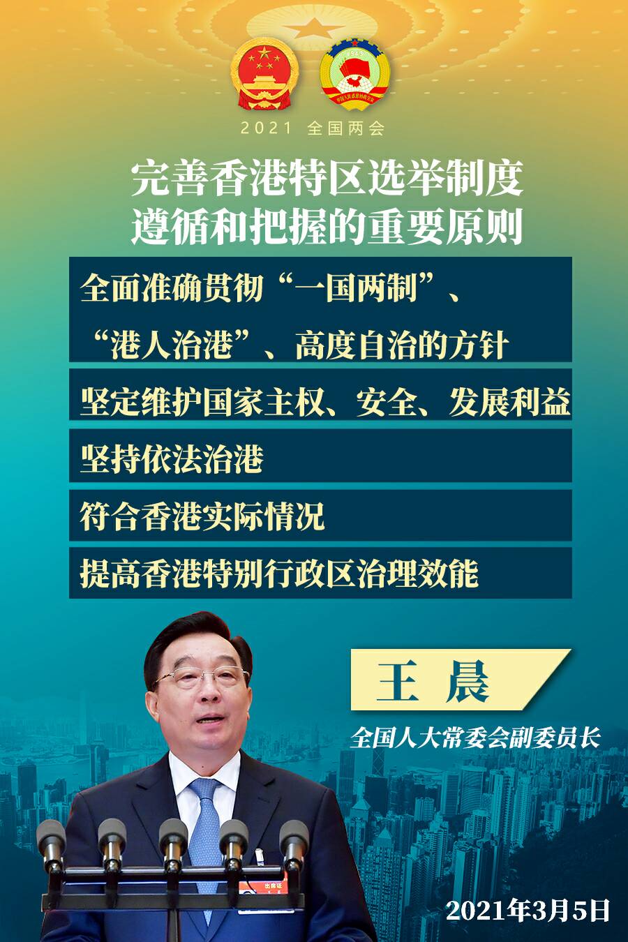 贯彻上述总体要求,必须遵循和把握好以下重要原则。一是全面准确贯彻“一国两制”、“港人治港”、高度自治的方针。坚持和完善“一国两制”制度体系,坚持以爱国者为主体的“港人治港”,把坚持“一国”原则和尊重“两制”差异、维护中央对特别行政区全面管治权和保障特别行政区高度自治权结合起来,为“爱国者治港”提供健全的制度保障。二是坚定维护国家主权、安全、发展利益。确保国家牢牢掌握完善香港特别行政区选举制度主导权,全面落实香港国安法,维护香港特别行政区社会大局稳定,坚决防范、制止和惩治外国和境外势力干预香港事务和利用香港进行分裂、颠覆、渗透、破坏活动。三是坚持依法治港。维护宪法和香港基本法确定的香港特别行政区宪制秩序,在宪法和香港基本法轨道上完善有关选举制度和相关机制,严格依照香港基本法、香港国安法、全国人大及其常委会有关决定和香港本地法律组织有关选举活动,提高依法治理能力和水平。四是符合香港实际情况。发展符合香港实际情况、体现社会整体利益的民主选举制度,依法保障香港同胞广泛的、均衡的政治参与,依法保障香港永久性居民依法享有的选举权和被选举权,团结一切可以团结的力量,广泛凝聚香港社会正能量。五是提高香港特别行政区治理效能。健全行政长官对中央人民政府负责的制度,维护行政主导的香港特别行政区治理架构和运行机制,支持行政长官和行政机关、立法机关、司法机关依法行使职权、履行职责,确保香港特别行政区政治体制和治理体制机制顺畅、有效运行。