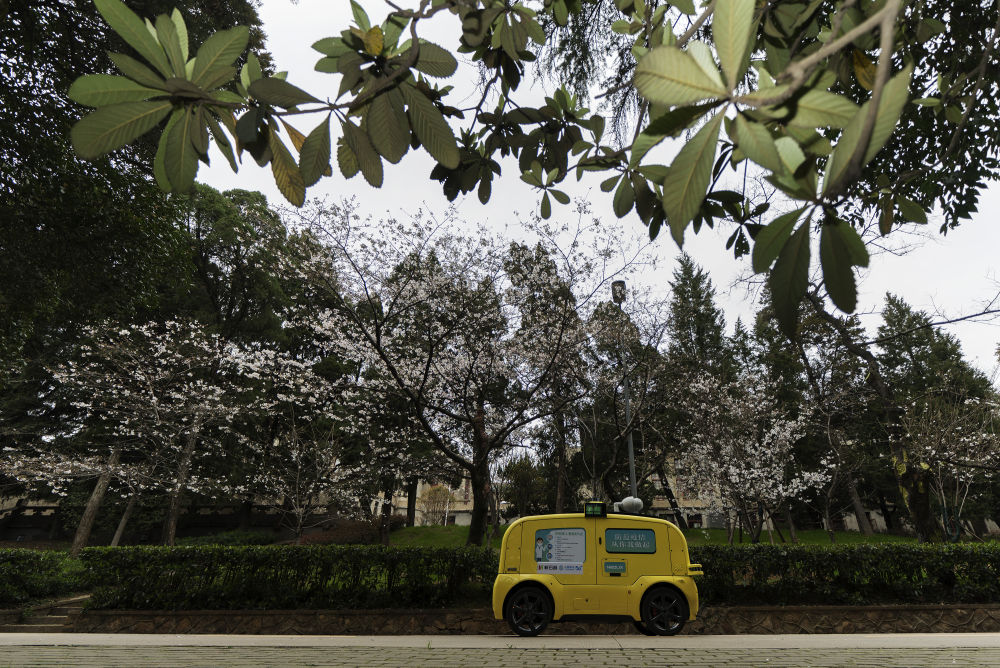 ↓2020年,樱花大道上,只有负责采集和传输直播信号的5G无人摄像车在武汉大学樱花大道进行不间断无人巡游,向全球媒体免费提供公共直播信号,全方位展示武汉大学的樱花季。