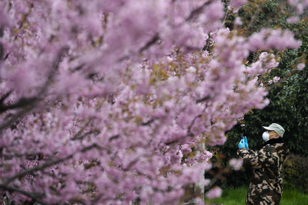 ↓ 2020年,在樱花树下驻足的,是偶尔路过的防疫工作人员。