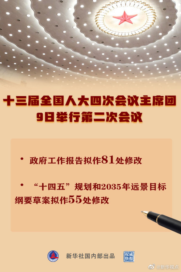 记者9日从十三届全国人大四次会议主席团第二次会议上获悉,政府工作报告拟作81处修改,“十四五”规划和2035年远景目标纲要草案拟作55处修改。(记者:杨维汉、罗沙、王琦)