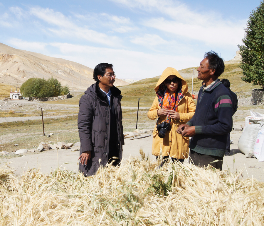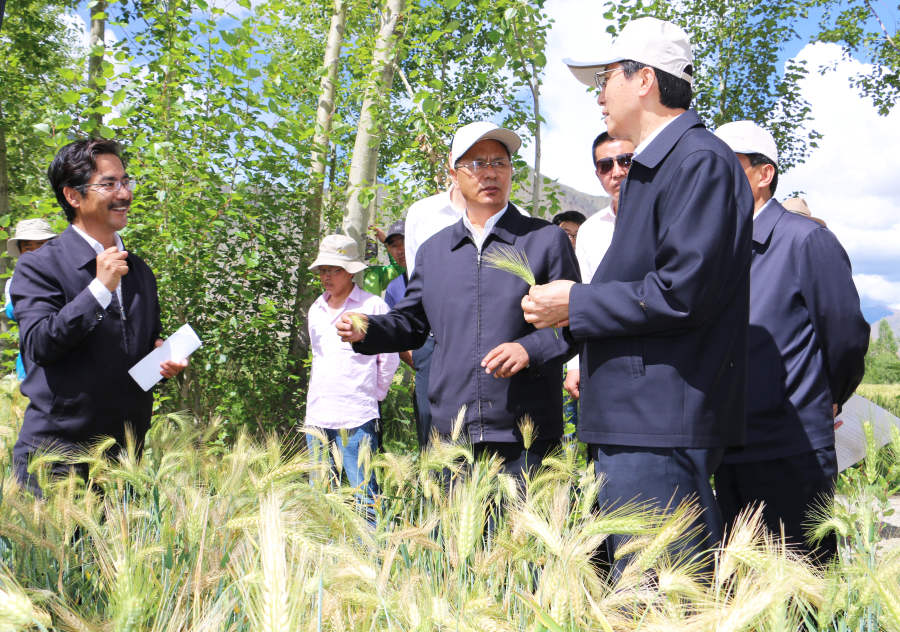 这是尼玛扎西(左一)在了解青稞种植情况。(资料照片)新华社发