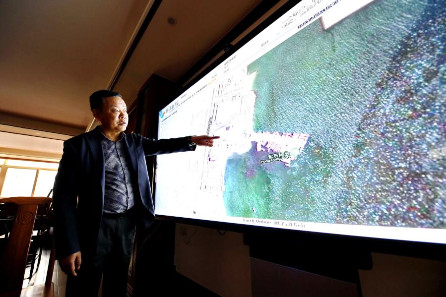 2月26日,兰平勇在公司通过卫星地图介绍该公司在毛里塔尼亚的远洋渔业基地建设情况。新华社记者 林善传 摄