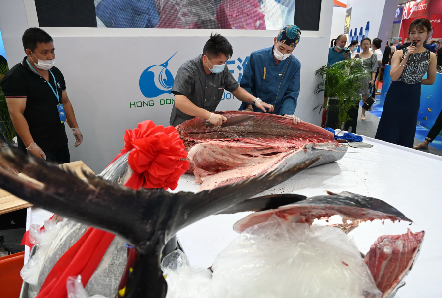 2020年海峡(福州)渔业周·中国(福州)国际渔业博览会上宏东渔业股份有限公司邀请专业人员为参观者展示蓝鳍金枪鱼切割技巧。(2020年9月4日摄)新华社记者 林善传 摄
