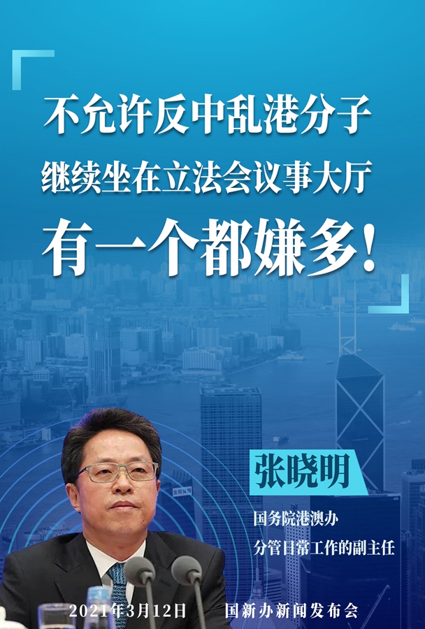 “这次完善香港特别行政区选举制度,就是要为全面落实‘爱国者治港’提供法律和制度保障,当然不能允许不爱国的人特别是反中乱港分子再进入香港特别行政区的治理架构,不能允许反中乱港分子继续堂而皇之地坐在立法会的议事大厅里面,一个都嫌多!这一点也是很明确的。”张晓明说。