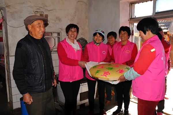 山东荣成人和镇灶户村巾帼志愿者给村里80岁老党员送去自制发糕,为老人庆祝生日。图片来源:荣成市文明办