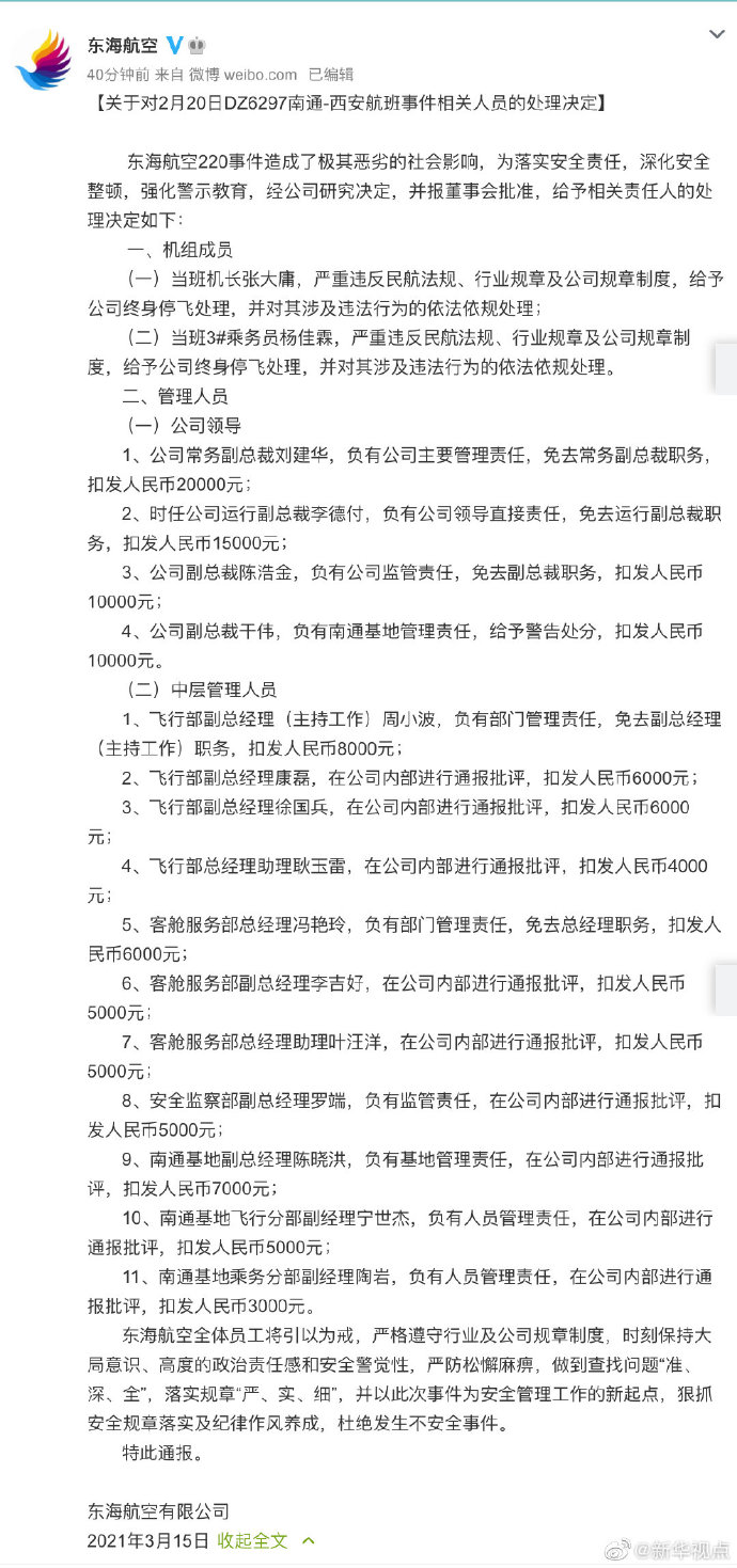 东海航空官方微博15日通报机组纠纷事件的处理决定:当班机长终身停飞,多人被免职。据媒体报道,2月20日,东海航空DZ6297航班(南通-西安)上,机长与一名乘务员发生互殴。以下为通报全文: