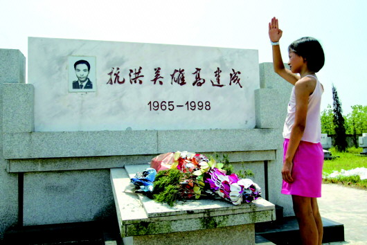 2002年8月29日,江珊向设立在湖北省嘉鱼县簰洲湾民垸中堡村村边的“抗洪英雄高建成”烈士墓致敬。新华社资料照片