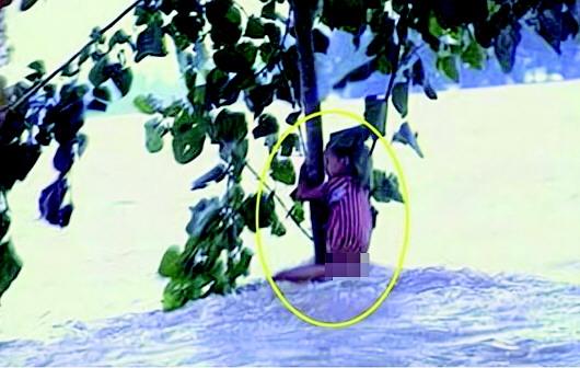 1998年8月2日,洪水中抱在树上等待救援的江珊。资料图片