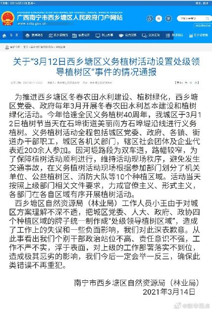 广西南宁市西乡塘区在植树活动中设置处级领导植树区引发关注,西乡塘区自然资源局(林业局)回应称是工作人员小王造成的。一项由党委政府组织开展、党政干部集体参加的大型活动,出现问题后,竟然把板子打在了一名普通工作人员身上。出了问题往下推,追究责任小王“背”,这种做法是官僚主义的典型表现。各级党政部门务必要提高政治站位、强化责任意识,不要让“小王”们成为“背锅侠”。(记者 黄浩铭)