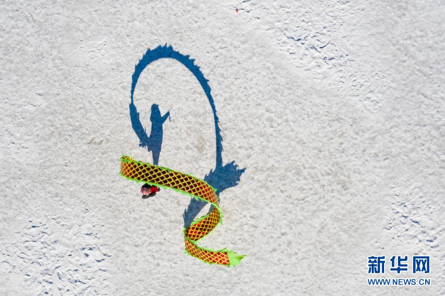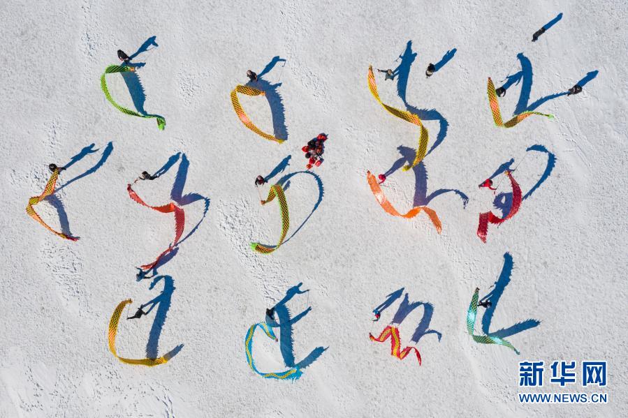 3月6日,健身爱好者在鹤岗市新一体育公园内舞彩带龙(无人机照片)。新华社记者 谢剑飞 摄