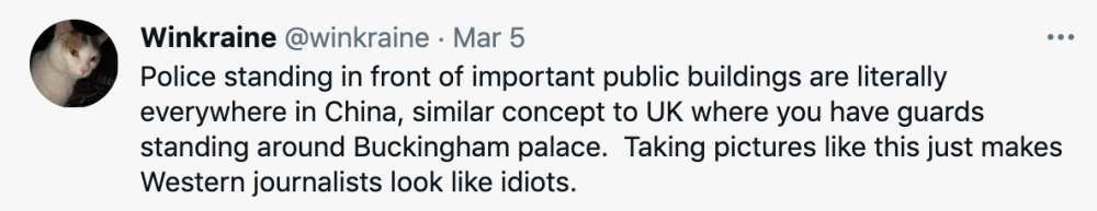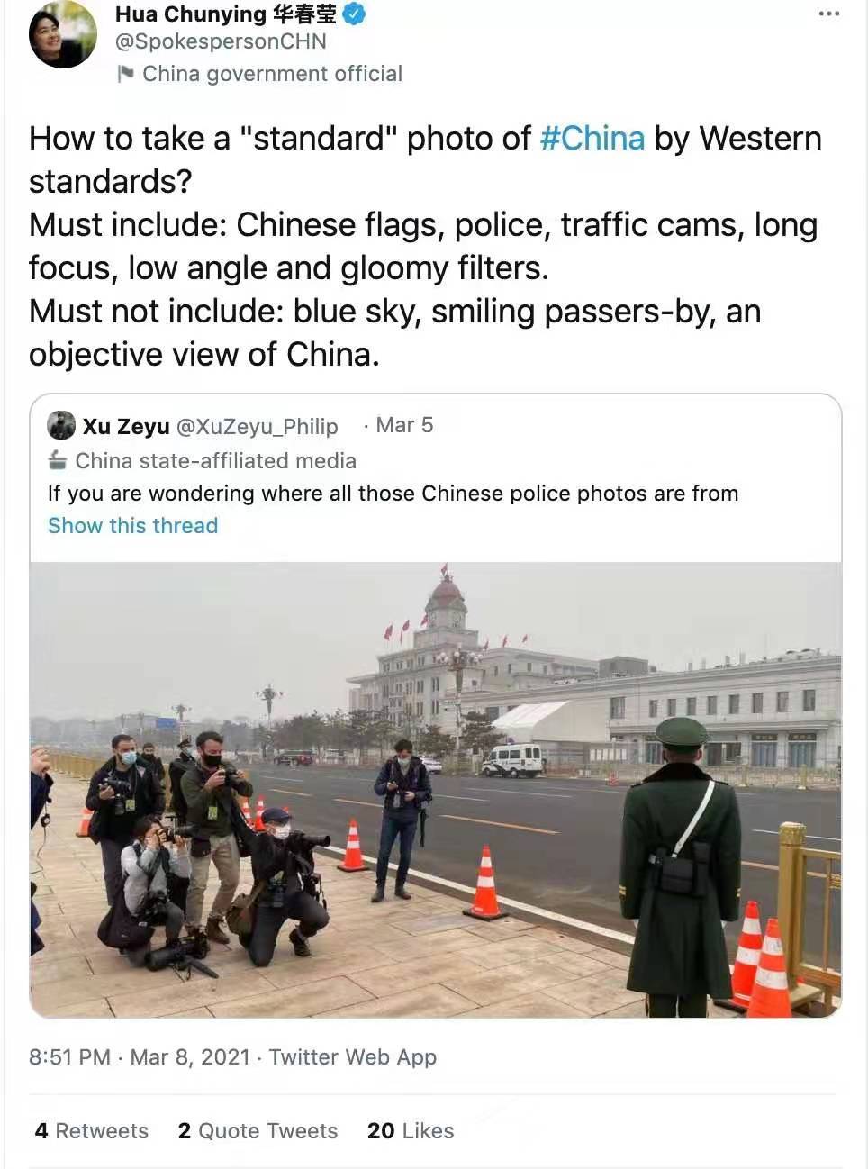 “这名武警战士根据规定不能随意移动,而他身后不远处就是人民大会堂——将一个标志性建筑与身着制服的人员同框,并以特定拍摄角度让后者显得具有侵略性——这简直就是一些外媒记者‘歪眼’中的‘完美构图’。”徐泽宇说。