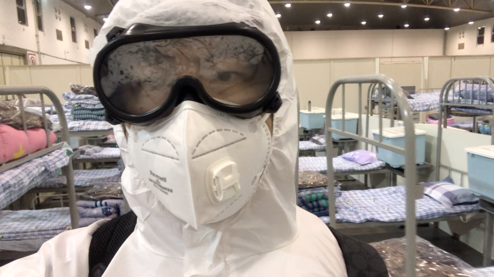 ↑2020年2月8日徐泽宇在“武汉客厅”方舱医院采访。