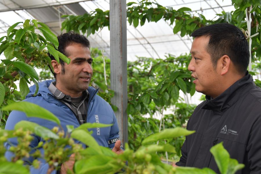 李海平(右)和金乐天(左)在交流樱桃种植管理技术(新华社记者张斌 摄)