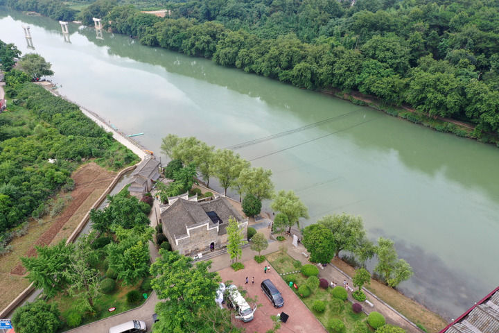 这是位于广西兴安县界首渡口附近的“三官堂”和湘江河段(2019年6月29日摄,无人机照片)。 新华社记者 陆波岸 摄