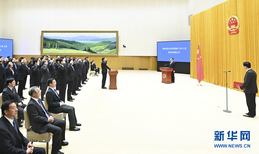 宣誓后,李克强希望大家以责履誓、以行践诺。他要求,要坚持以习近平新时代中国特色社会主义思想为指导,依宪施政、依法行政。一要严格依法履职,把尊法学法守法用法化为自觉行动,不断提高运用法治思维和法治方式推动工作的能力,推进法治政府建设。二要倾心为民造福,坚持以人民为中心的发展思想,围绕市场主体和民生急需制定实施各项政策,为市场主体纾困助力,更好解决民生痛点难点问题。三要奋力实干担当,善用改革开放的思路和办法,秉持务实精神和作风,竭力勤勉任事,持续攻坚克难,不断创造人民满意的新业绩。四要守牢清廉底线,明纪自守、怀德自重,节用裕民、清白做事。不负党和人民重托,为建设富强民主文明和谐美丽的社会主义现代化强国不懈奋斗。