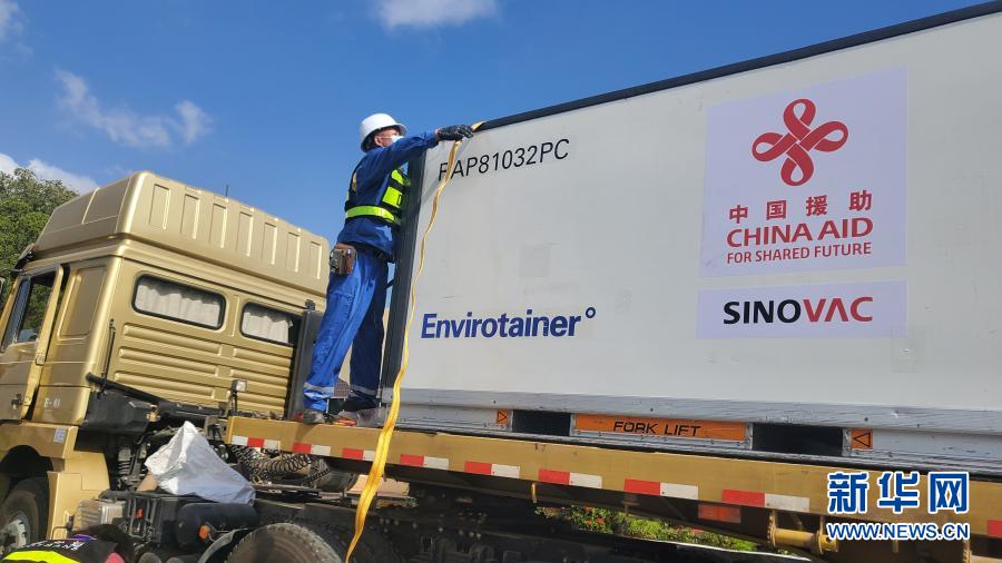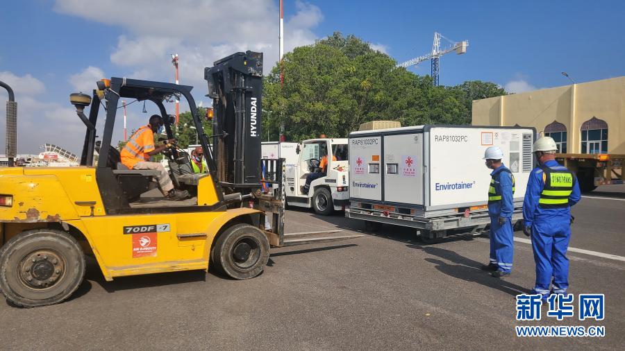 3月18日,在吉布提昂布利国际机场,工作人员转运新冠疫苗。新华社发(中国驻吉布提大使馆供图)