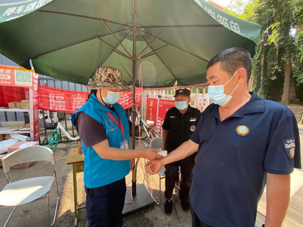 “永定路上蓝马甲”志愿者参加社区值守。