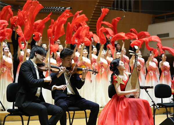 中央民族乐团的艺术家们精彩演绎了《新十送红军》、《洪湖》、《不忘初心》等多首耳熟能详的经典歌曲和新创作改编的作品。活动现场,歌声、乐声、掌声相互交织,大家或拍掌应和,或轻声跟唱,台上台下频频互动。中央和国家机关青联副主席、中央民族乐团团长赵聪创作并领衔演出的琵琶、钢琴、弦乐四重奏与合唱《红旗·升》,用中国经典的传统乐器与当代文化相结合的形式,表达对党的深厚情感,琵琶言志,泛音燃情,将活动推向了高潮。