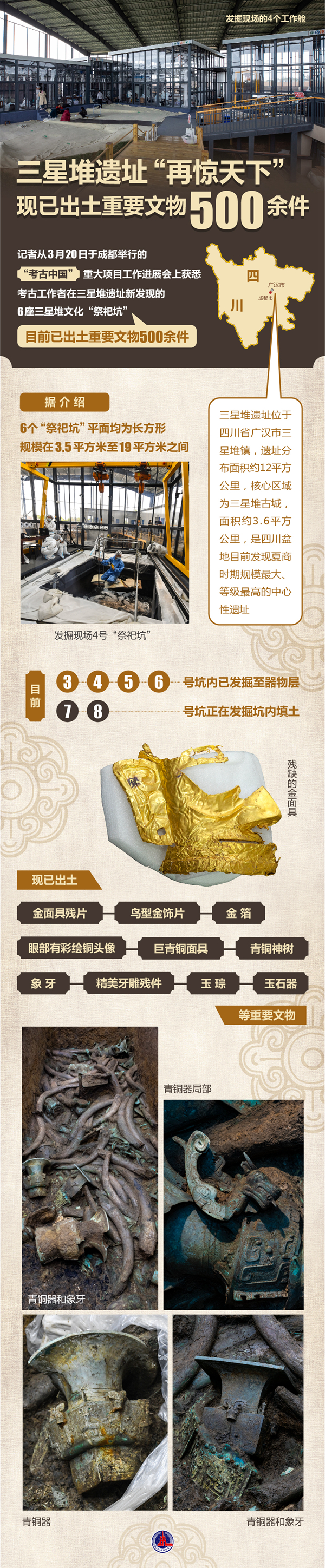 据介绍,6个“祭祀坑”平面均为长方形,规模在3.5平方米至19平方米之间。目前,3、4、5、6号坑内已发掘至器物层,7号和8号坑正在发掘坑内填土,现已出土金面具残片、鸟型金饰片、金箔、眼部有彩绘铜头像、巨青铜面具、青铜神树、象牙、精美牙雕残件、玉琮、玉石器等重要文物500余件。
