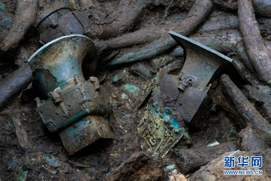 这是在三星堆遗址考古发掘现场3号“祭祀坑”内拍摄的青铜器和象牙(3月16日摄)。新华社记者 沈伯韩 摄