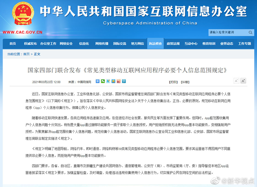 国家网信办、工信部、公安部、国家市场监管总局近日联合发布《常见类型移动互联网应用程序必要个人信息范围规定》,明确了地图导航、网络约车、即时通信、网络购物等39类常见类型移动应用程序必要个人信息范围,要求自2021年5月1日起,其运营者不得因用户不同意提供非必要个人信息,而拒绝用户使用App基本功能服务。(记者 王思北)