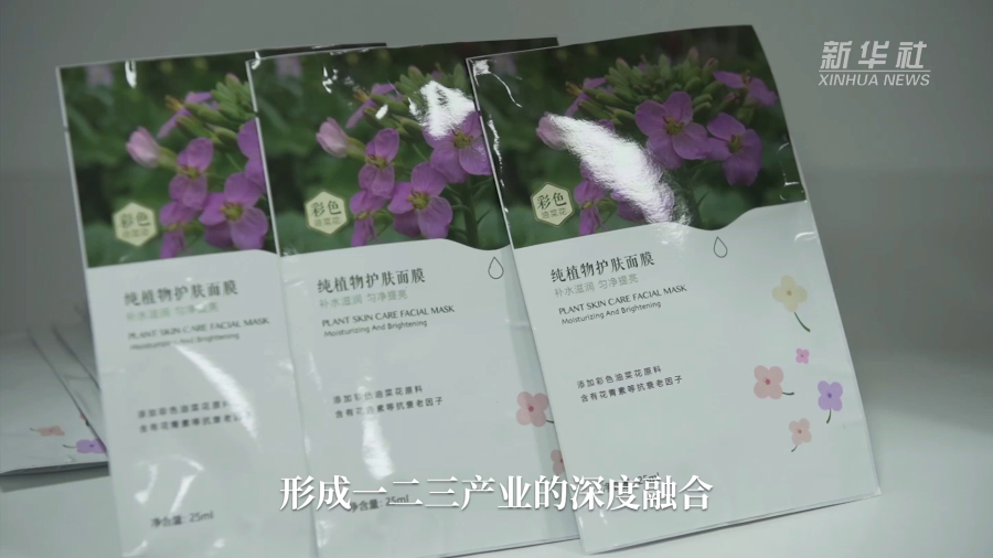 ↑付东辉教授团队和市场机构联合研发的彩色油菜花面膜产品。新华社记者 余刚 摄