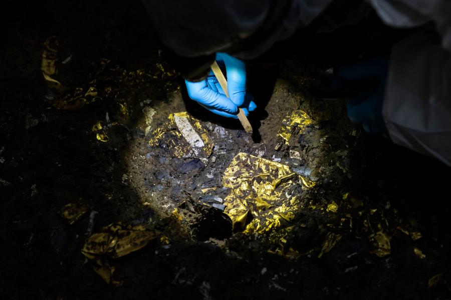 5号“祭祀坑”发现的金器。(新华社记者沈伯韩摄)