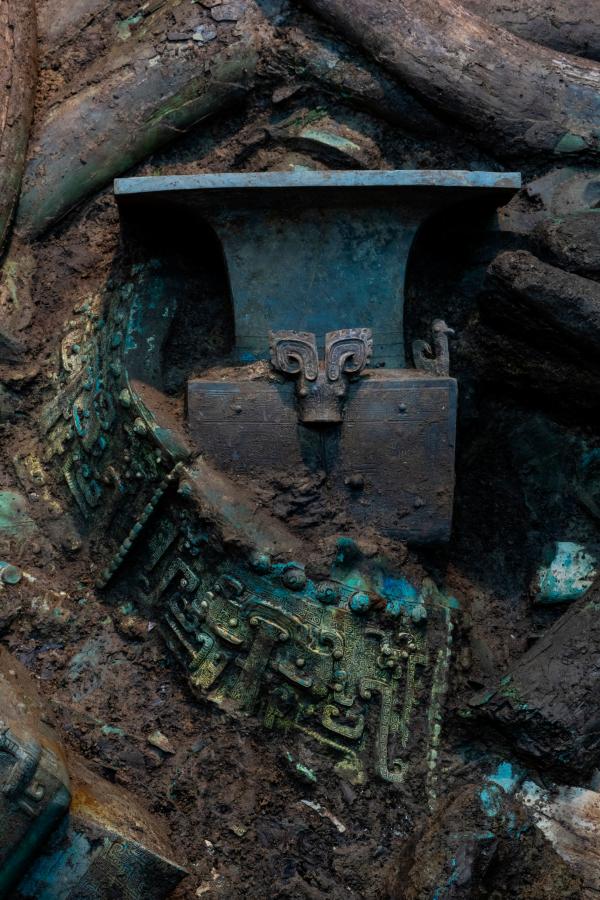 3号“祭祀坑”青铜器上的精美纹饰。(新华社记者沈伯韩摄)
