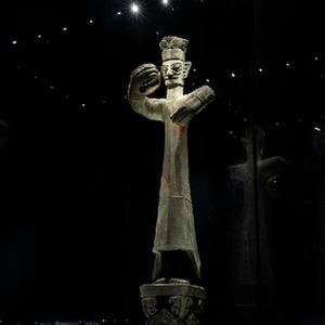 1986年2号“祭祀坑”出土的“青铜大立人”人像高达一米八,加上基座通高约两米六,被称为“东方巨人”。