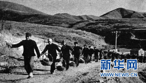 沙石峪村民担土劳作场景(翻拍资料照片)。新华社发