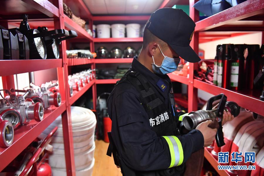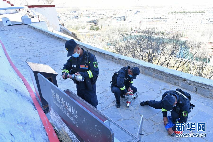 布达拉宫消防救援大队队员在宫殿微型消防站维护消防设备(3月4日摄)。新华社记者 孙瑞博 摄