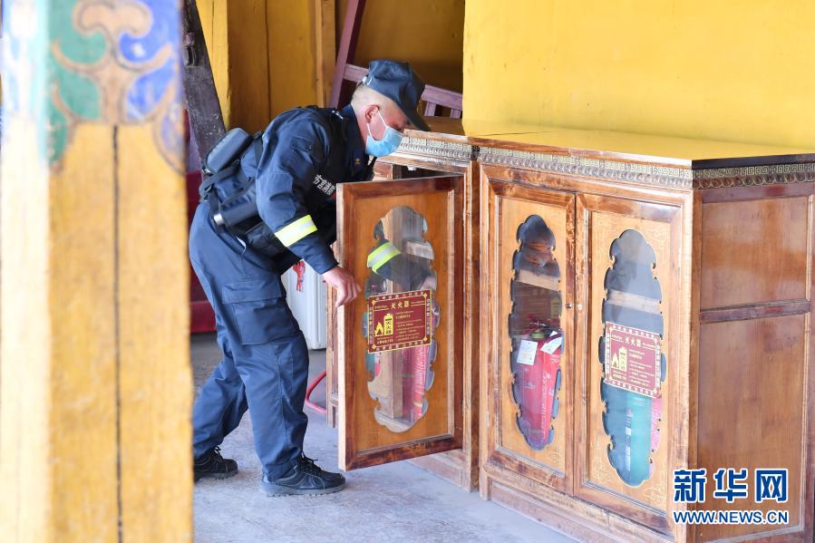 布达拉宫消防救援大队队员在巡逻期间检查消防设施(3月4日摄)。新华社记者 孙瑞博 摄