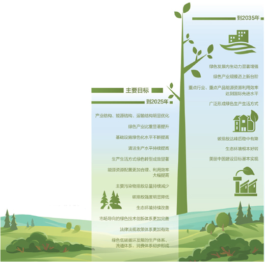 到2025年,产业结构、能源结构、运输结构明显优化,绿色产业比重显著提升,基础设施绿色化水平不断提高,清洁生产水平持续提高,生产生活方式绿色转型成效显著,能源资源配置更加合理、利用效率大幅提高,主要污染物排放总量持续减少,碳排放强度明显降低,生态环境持续改善,市场导向的绿色技术创新体系更加完善,法律法规政策体系更加有效,绿色低碳循环发展的生产体系、流通体系、消费体系初步形成。