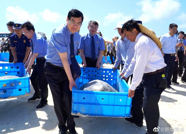 25日,以“保护海龟,守护海洋我们共同行动”为主题的第二批检察机关公益诉讼涉案海龟放流活动在三沙市永兴岛海域进行。160只涉案海龟被放归大海,回到了它们自己的家园。2021年新修订的国家重点保护野生动物名录中,将我国分布的海龟保护级别由国家二级重点保护野生动物提升为一级。本次放流的海龟均为涉案海龟,办案同时,检察机关首创“诉放分离”模式,在相关证据固定后,同步开展海龟救护和放归工作。放流的海龟都经过专家救治和野化训练,每只海龟身上都带有“电子身份证”芯片,便于后期跟踪保护。(记者:陈菲,图片由最高检提供)