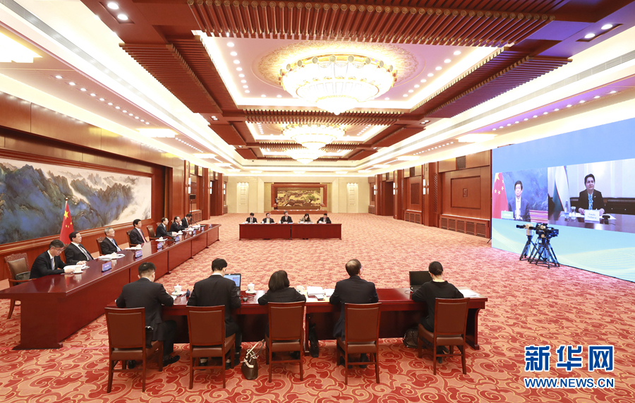 3月26日,全国人大常委会委员长栗战书在北京人民大会堂以视频方式同乌兹别克斯坦最高会议参议院主席纳尔巴耶娃举行会谈。新华社记者 庞兴雷 摄