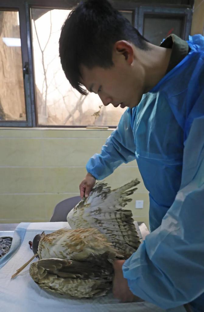 3月28日,白仁文在沈阳猛禽救助中心检查受伤猛禽伤势。记者杨青摄
