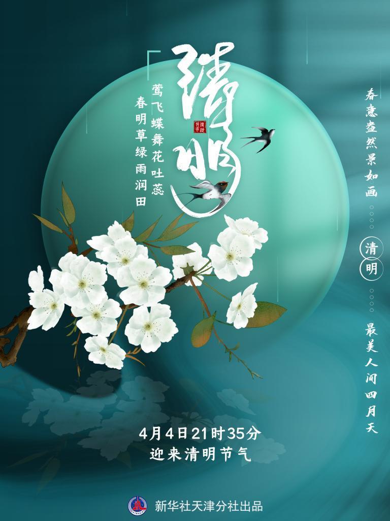 新华社天津4月2日电(记者周润健)“满眼游丝兼落絮,红杏开时,一霎清明雨。”《中国天文年历》显示,北京时间4月4日21时35分将迎来清明节气。此时节,春回大地,天朗气清,桃红柳绿,花开缤纷,莺飞蝶戏,燕子归来。